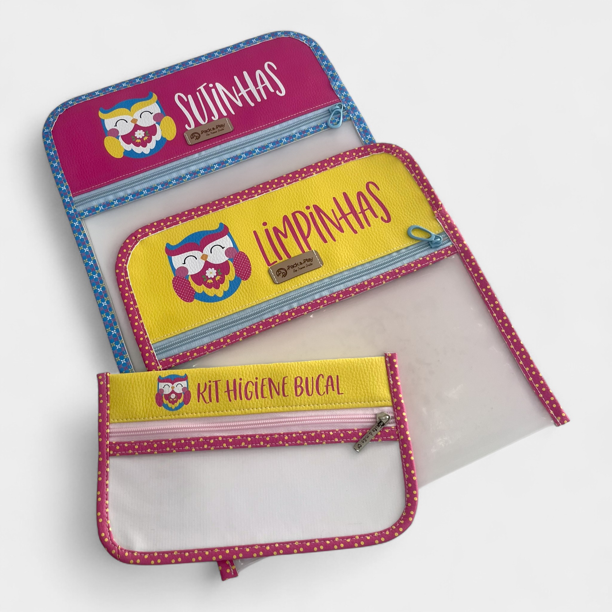 O Kit Higiene foi desenvolvido para trazer mais organização e praticidade à rotina das crianças. Produzido à mão em material sintético de alta qualidade e acabamento impermeável, é fácil de limpar e super resistente.
